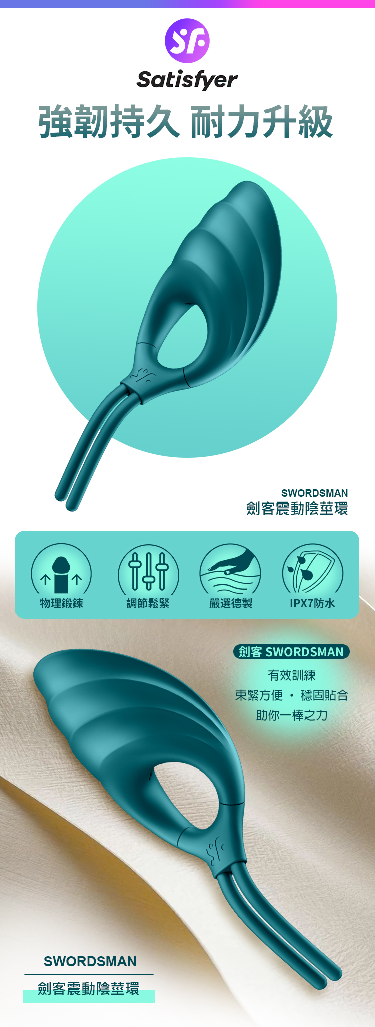 由德國研發設計的 Satisfyer Swordsman 劍客,以創新「滑扣式可調節環」設計,讓鬆緊自由掌控。